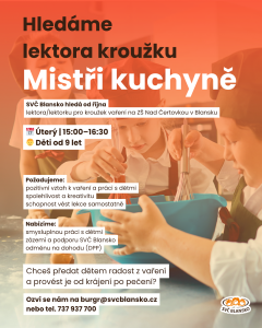 Hledáme nového lektora nebo lektorku kroužku Mistři kuchyně v Blansku. Kroužek probíhá na ZŠ